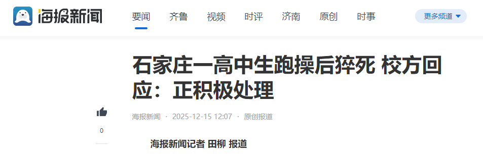 近日,河北石家庄精英中学一名高一女生,在校跑操后身体不适,经抢救无效离世。校方在接受海报新闻记者采访时回应,正在积极处理此事。